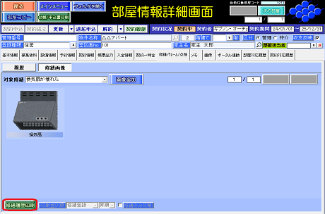 物件情報詳細画面および部屋情報詳細画面の[修繕/クレーム/点検履歴]タブの[修繕画像]ボタン内の[修繕履歴印刷]ボタンで操作します。