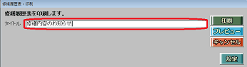 [修繕履歴印刷]ボタンを押すとウインドウ「修繕履歴表:印刷」が表示されますので、「タイトル」欄の初期値「賃貸物件の修繕履歴表」を文言を変更します。