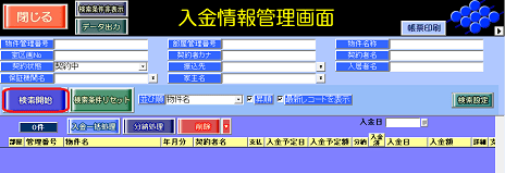 [最新レコードを表示]チェック付与後に[検索開始]ボタンを押すと、各契約者の最新入金レコードが表示します。[最新レコードを表示]チェックを付与したタイミングで契約状態「契約中」が検索条件に追加されますので、必要に応じて検索条件を変更してご利用ください。
