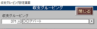 ②収支グルーピング設定画面で親データにする物件を収支グルーピング欄に指定し、[閉じる]ボタンで画面を閉じます。グルーピング設定は、同一家主物件のみ設定可能です。