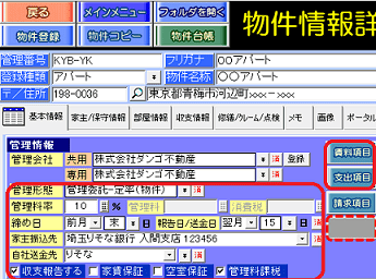 管理形態や締め日、支出項目等の管理情報欄で設定した内容は、親物件の設定を参照し月次報告書が作成されます。