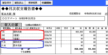 ②月次収支報告書を開くと「収入の部」欄に親物件の各区画と子物件の各区画が表示されます。