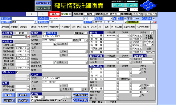 ①部屋情報詳細画面を開き、[契約履歴]ボタンを押します。