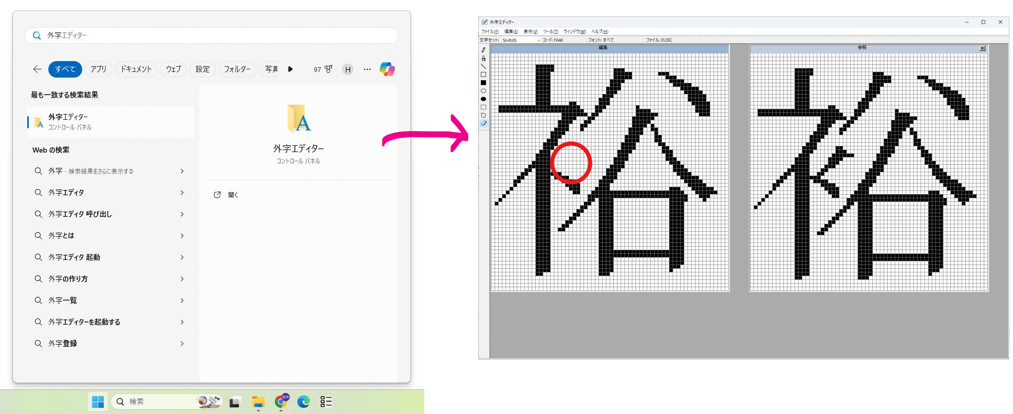 名人シリーズは Windows アプリケーションであるため、Windows の機能「外字エディター」と「IMEパッド」を組み合わせて用いることで、対応が可能です。