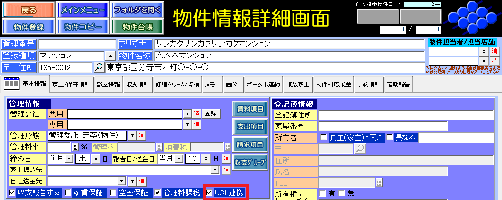UCL連携する物件は、物件情報詳細画面[基本情報]タブの[UCL連携]チェックを付けます。