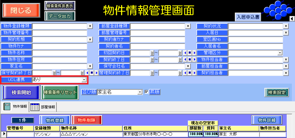 [UCL連携]チェックを付けた物件は、以下の画面で検索項目「UCL連携」を使用して対象物件を検索することができます。検索条件の操作方法は、弊社FAQ「15040」でご確認いただけます。
