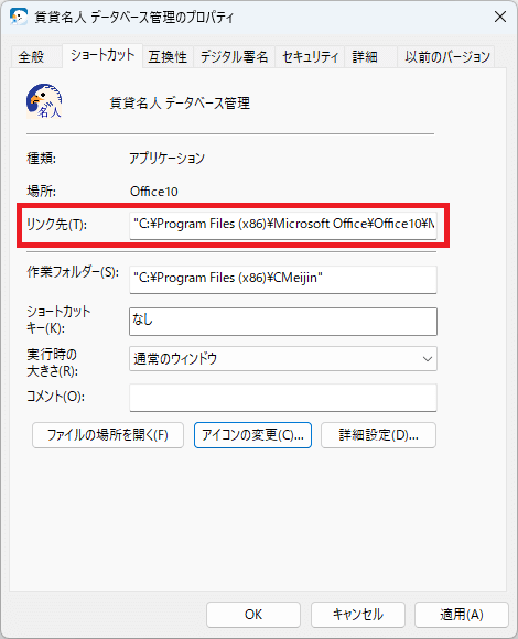 (2)[プロパティ]を押し、[賃貸名人のプロパティ]画面を開きます。