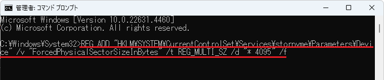 REG ADD "HKLM\SYSTEM\CurrentControlSet\Services\stornvme\Parameters\Device" /v "ForcedPhysicalSectorSizeInBytes" /t REG_MULTI_SZ /d "* 4095" /f