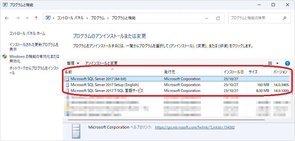 (4)コントロールパネルにインストール途中の一部のMicrosft SQL Server 2017がインストールされていた場合は、先にアンインストールします。念のため、インストール日が作業した日か確認してから実行してください。