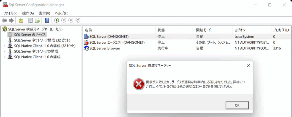 『ローカルコンピューターのSQL Server(DANGONET)サービスを開始できません。