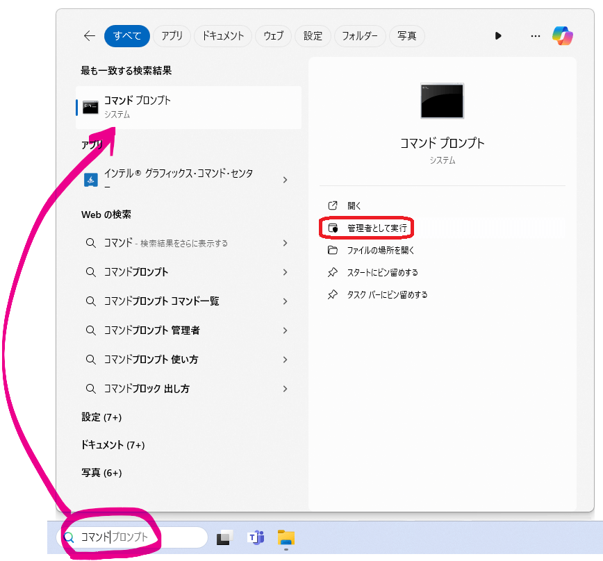 タスクバーの「検索」欄に「コマンドプロンプト」と入力します。