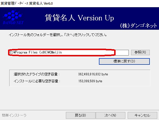 その際、併せて「インストール先フォルダ」の指定に誤りがないかをご確認ください。