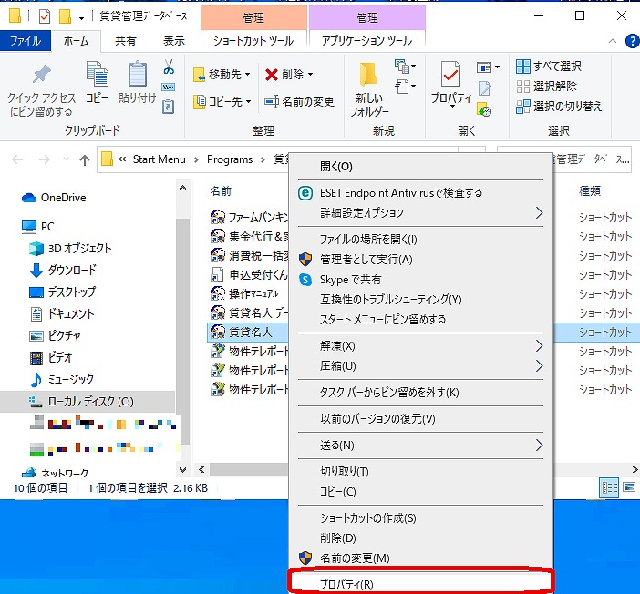 フォルダ内のショートカットで[プロパティ]を開きます。