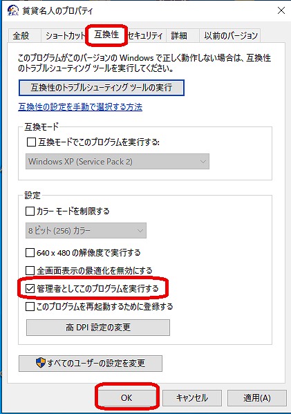 (2)[互換性]タブの[管理者としてこのプログラムを実行する]チェックを付与し、[OK]ボタンを押します。