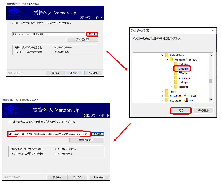 バージョンアッププログラムを再度実行し、[参照]ボタンでVirtualStore下のフォルダに適用先を変更します。