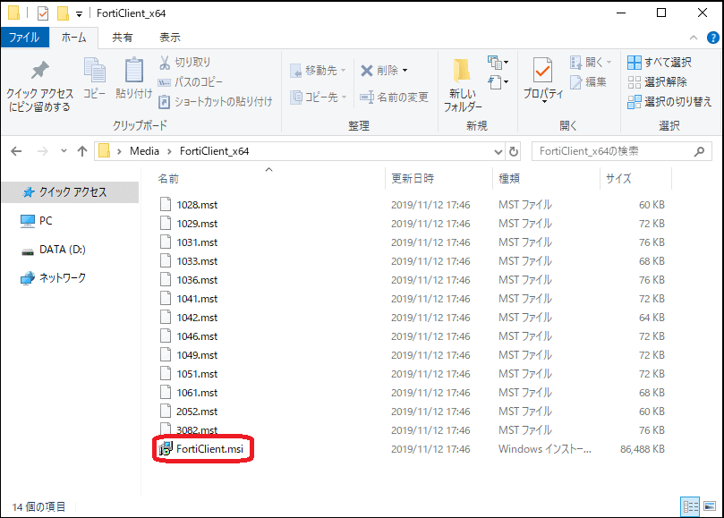 (2)[FortiClient_x64]フォルダを開き、FortiClient.msi を実行します。