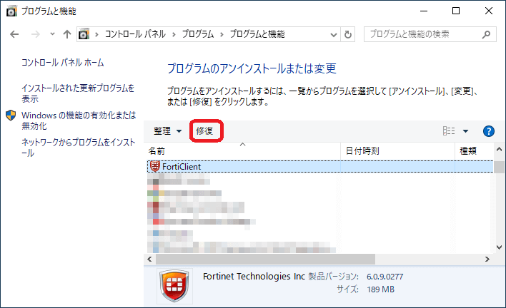 (2)「プログラムと機能」で、FortiClient の「修復」を実行します。