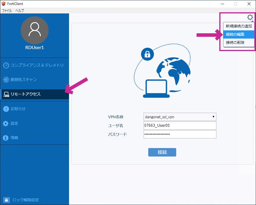 ①FortiClientのコンソールを開き接続先の編集を行います。