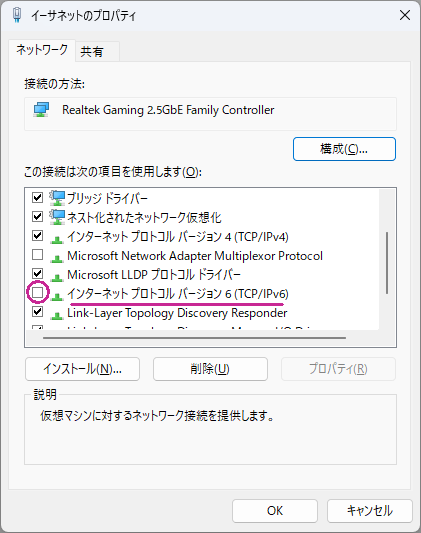 2.ネットワークアダプタのプロパティからIPv6を無効にする