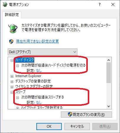 電源管理の設定で、「ハードディスク」「スリープ」の設定時間を見直しします。