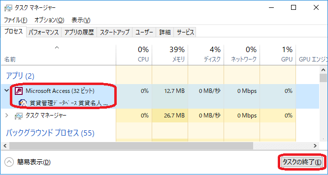 (3)[タスクの終了(E)]ボタンをクリックします。