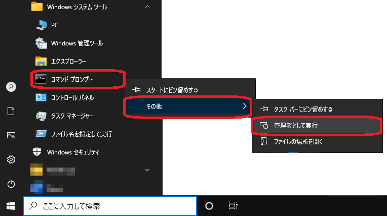Windowsスタート>Windowsシステムツール>「コマンドプロンプト」の上で右クリックします。