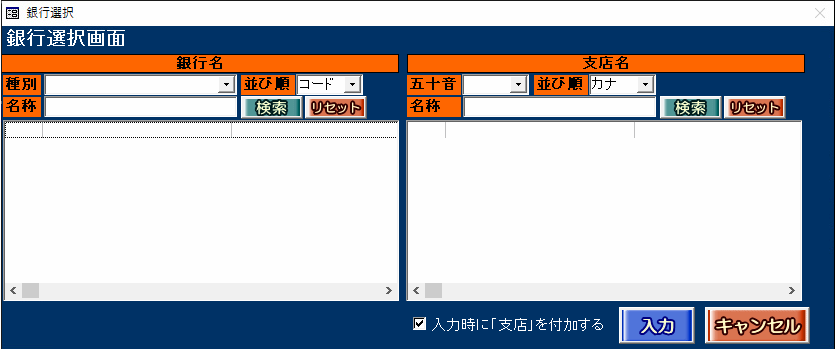 ・銀行選択画面に「銀行名」や「支店名」の選択候補が表示されません。選択することができません。