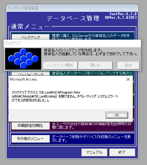 賃貸名人データベース管理でバックアップ処理を実行したところ、次のエラーメッセージが表示されました。