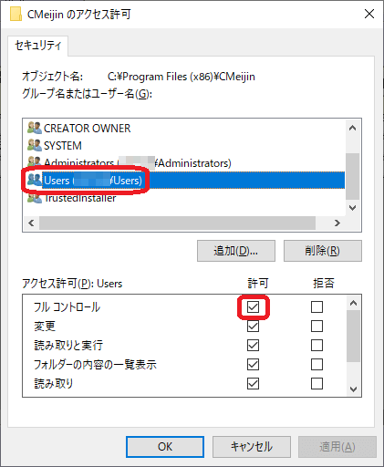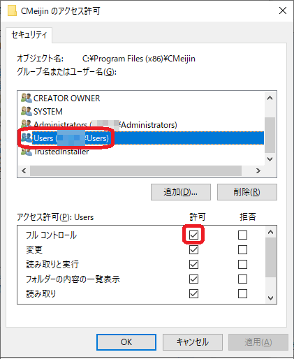 2.インストールフォルダにUSERSフルコントーロールを付与する
