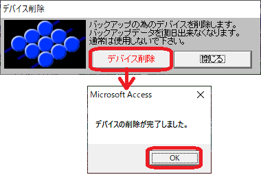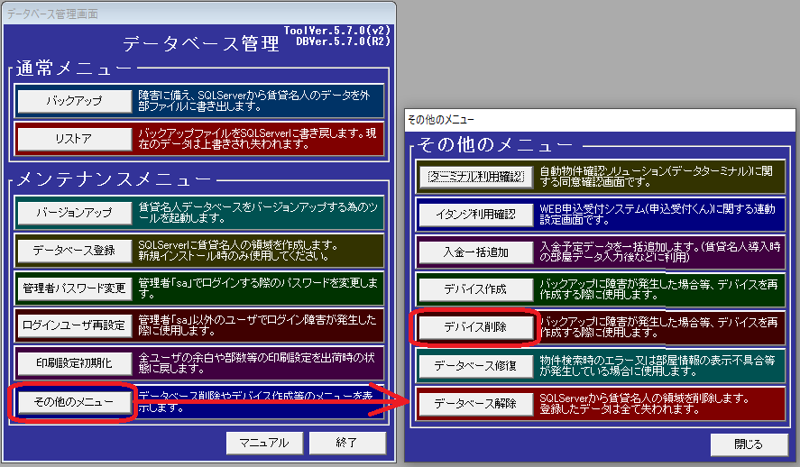 (1)データベース管理画面の[その他のメニュー]ボタンの[デバイス削除]ボタンをクリックします。
