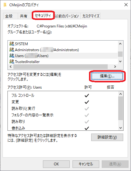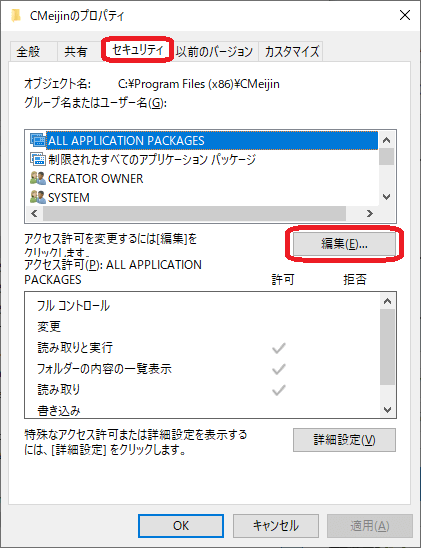 (2)[セキュリティ]タブの[編集(E)]ボタンをクリックします。