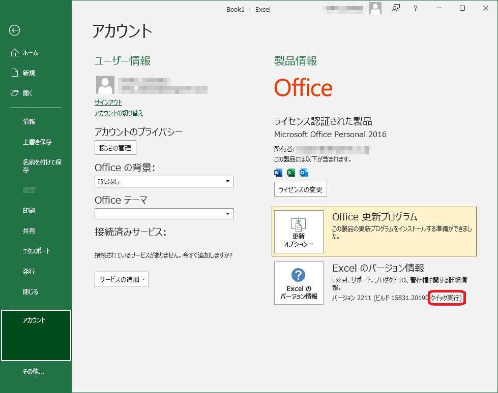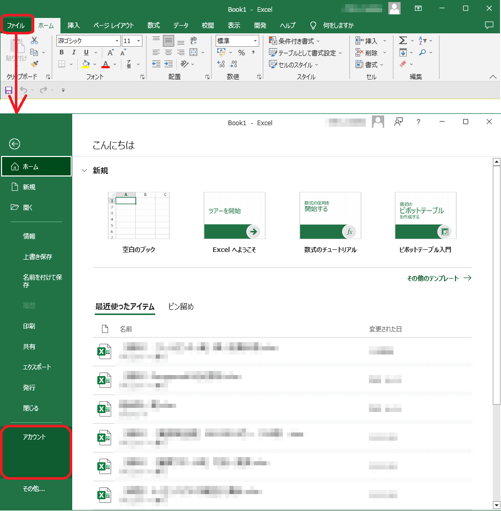 (1)Office アプリを起動し、[ファイル] タブの[アカウント] をクリックします。
