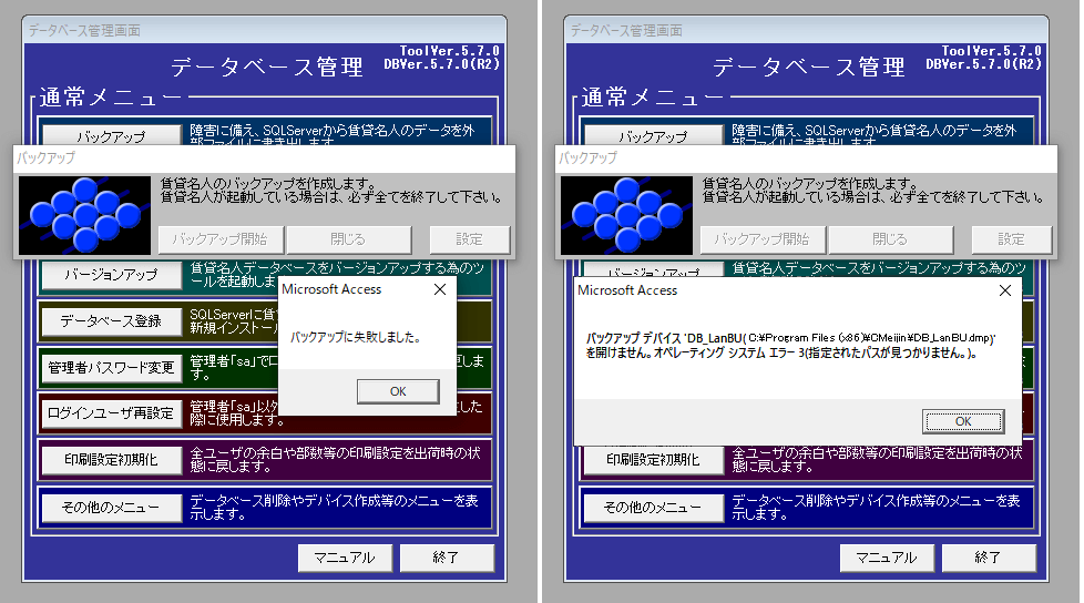 賃貸名人データベース管理でバックアップ処理を実行したところ、次のエラーメッセージが表示されました。