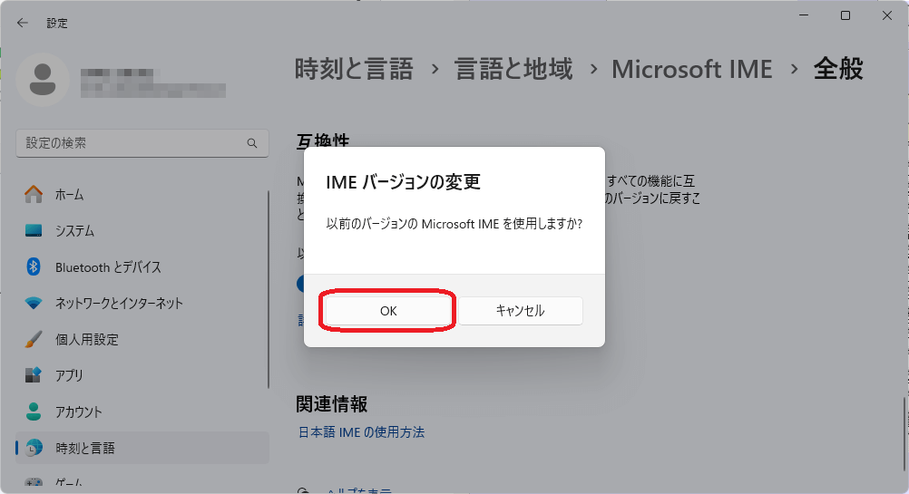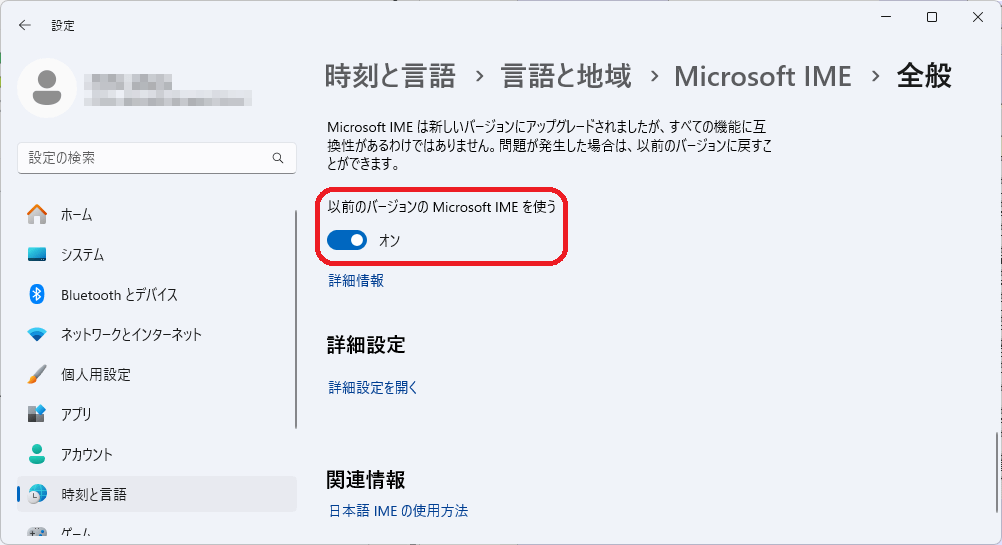 「互換性」欄の「以前のバージョンのMicrosoft IMEを使う」欄を参照し、設定を変更します。