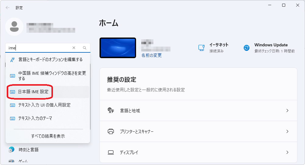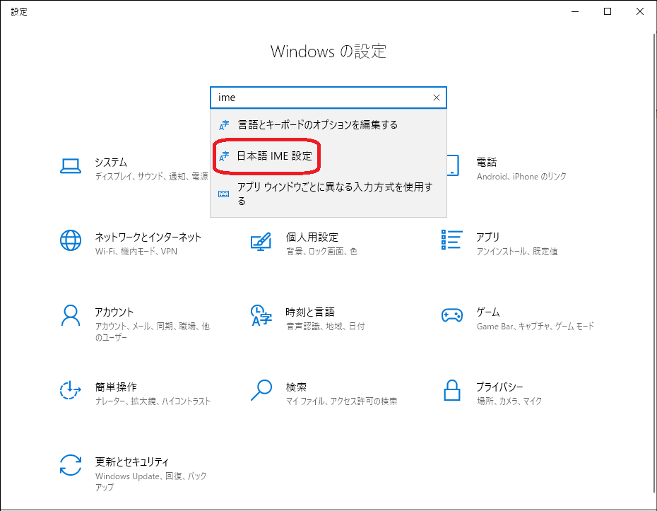 スタートの「設定」を選択し、検索ボックスに「IME」と入力し、「日本語 IME 設定」を選択します。
