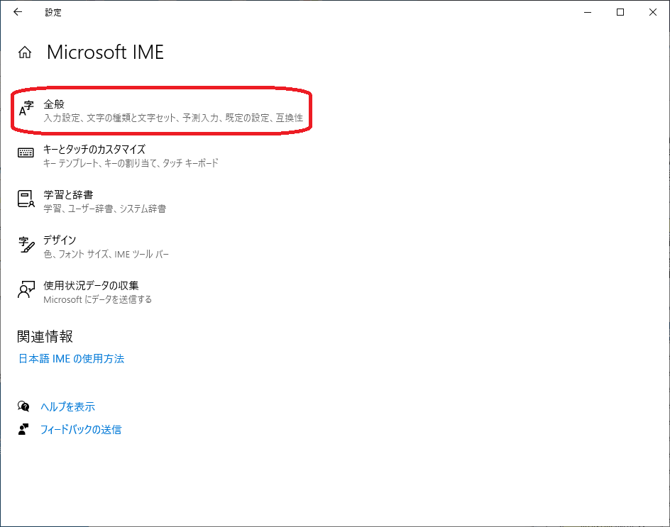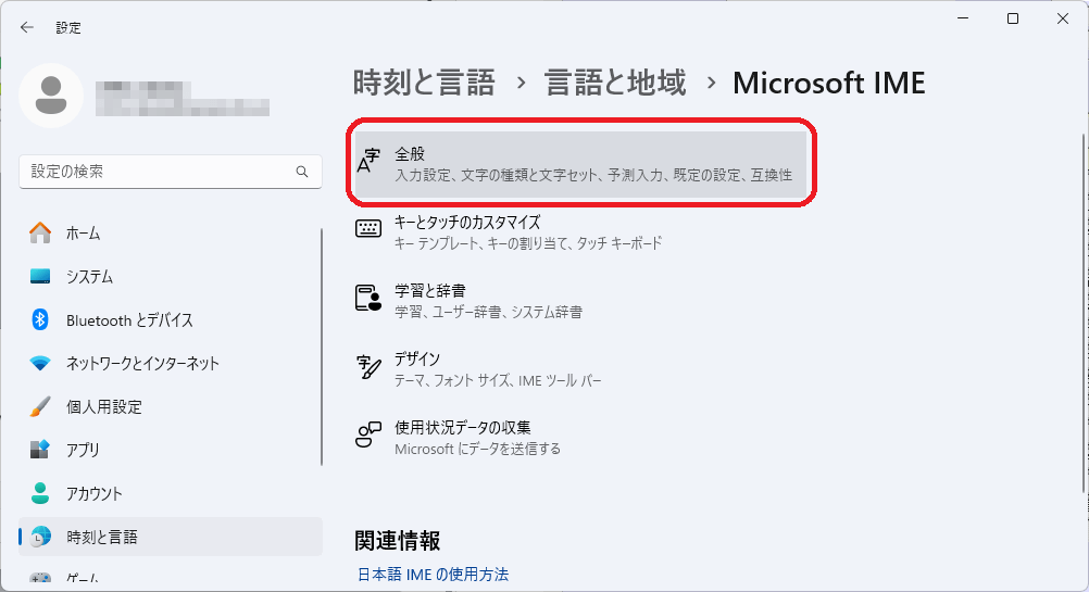 [時刻 と言語 ] > [言語と地域] > [Microsoft IME] の「全般」を選択します。