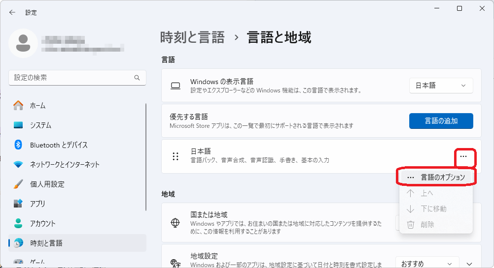 「日本語」 欄の「…」を右クリックし、 [言語のオプション] を選択します。