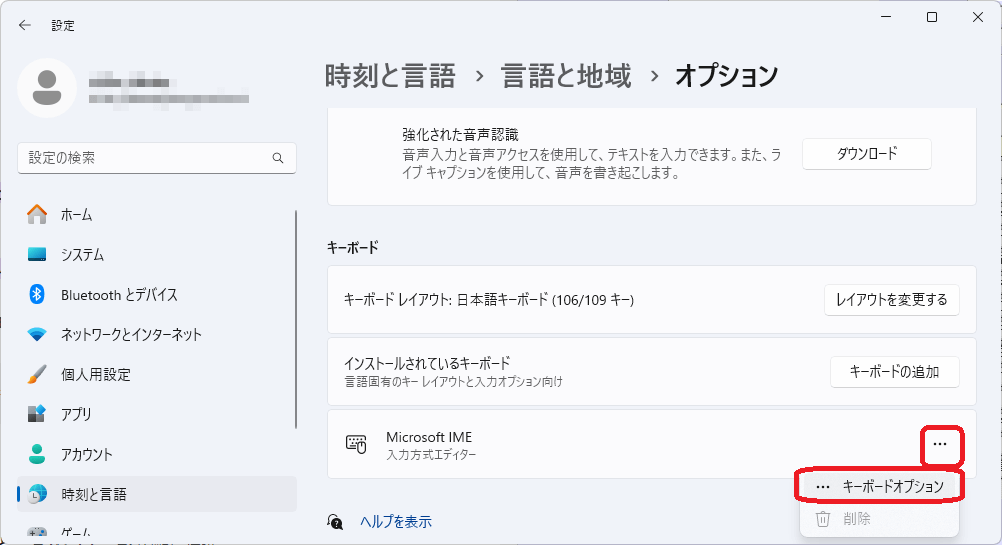 「Microsoft IME」 欄の「…」を右クリックし、 [キーボード オプション] を選択します。