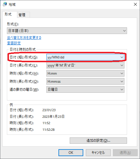 (3)[形式]タブの「日付と時刻の形式」の「日付(短い形式)(S):」欄