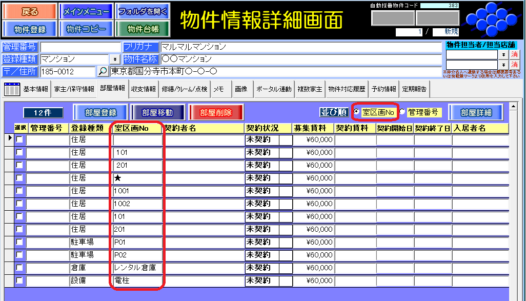 (2)「室区画№」を「数字」で入力すると、画面の左側から若い数字順(数字の桁を含む)に並びます。