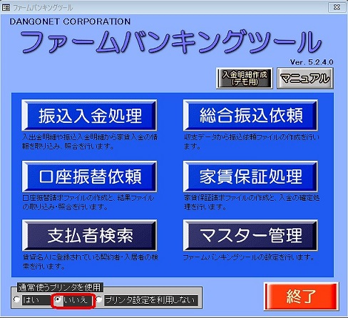 (1)ファームバンキングツールのメインメニューを開き、「通常使うプリンタを使用」欄の「いいえ」を選択します。