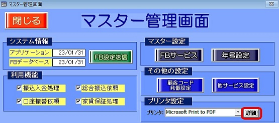 (2)[マスター管理]ボタンを押し、マスター管理画面を開きます。プリンタ設定内にある[詳細]ボタンを押します。