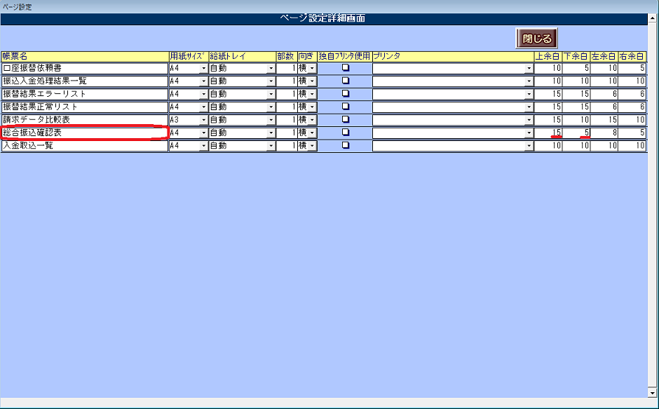 帳票名「総合振込確認表」の「上余白」または「下余白」の数値を変更してください。