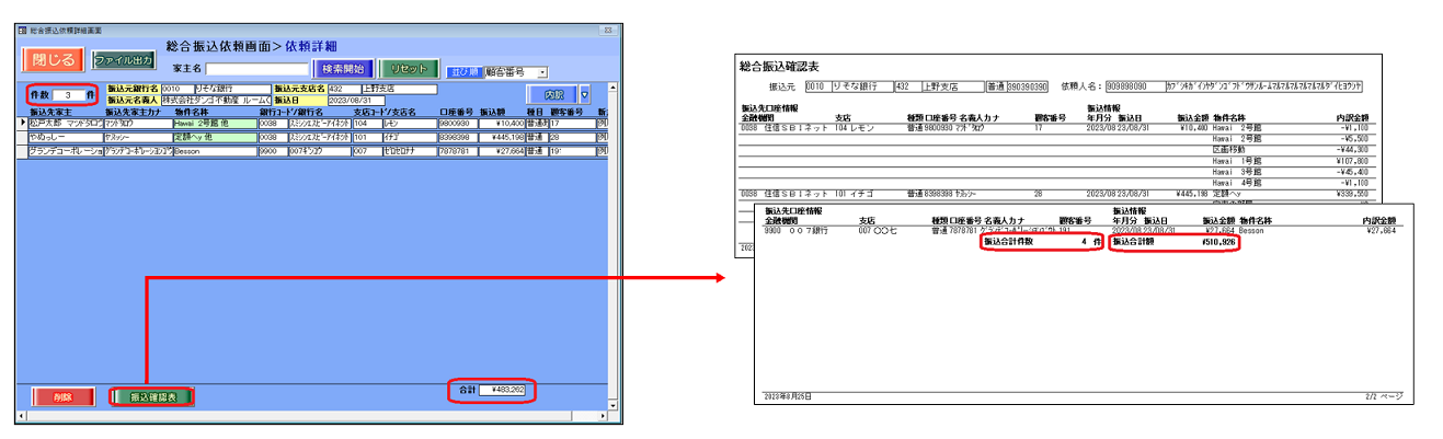 総合振込確認表の最終ページが1レコードのみ表示されている場合、該当レコードの情報を重複して「件数」「合計金額」に印字してしまうことが原因です。
