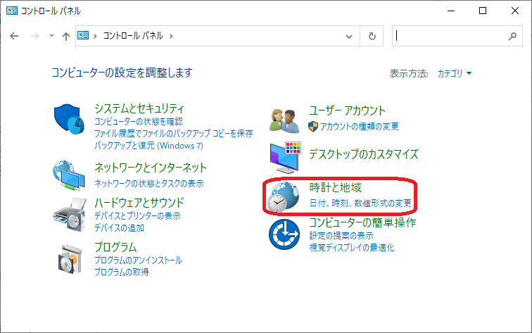 (1)[コントロールパネル]より、[時計と地域]を選択します。