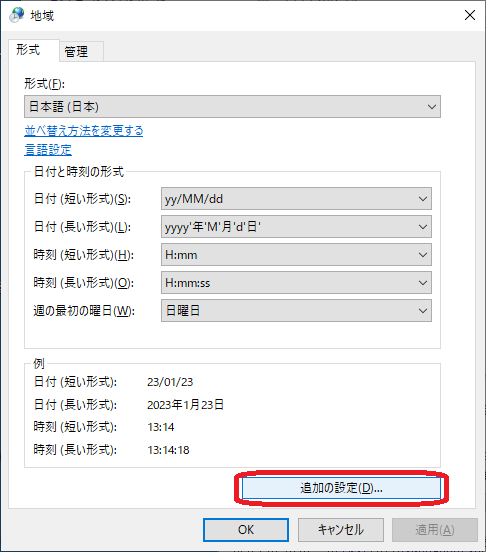 (2)「地域」ウインドウの[形式]タブより、[追加の設定]ボタンをクリックします。