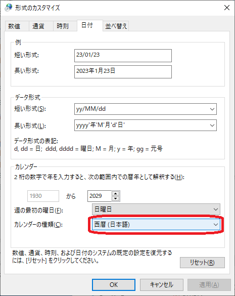 (3)「形式のカスタマイズ」ウインドウ内の[日付]タブで、「カレンダー」欄の設定を変更します。