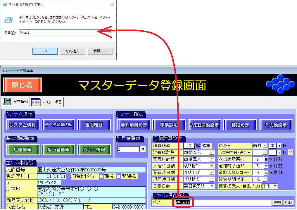 マスター管理画面の「ファイル保存設定」の「パス」欄で指定している場所が存在しない、あるは認識ができない状況の場合にエラーメッセージを表示します。