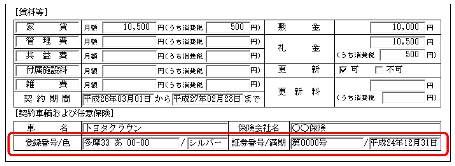 賃貸名人5.3.4で、[契約車輌および任意保険]の「登録番号」と「色」、「証券番号」と「満期」を同じ枠内に配置するレイアウトに変更しました。