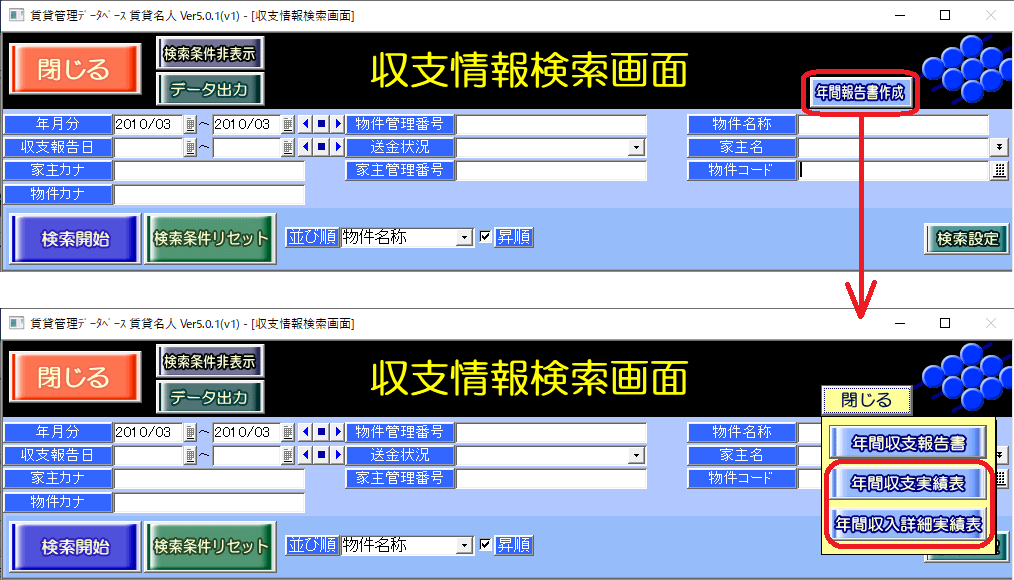 賃貸名人5.0.1で、駐車場用の「年間収支実績表」「年間収入詳細実績表」をご用意しました。月次報告書と同様、「管理費」「共益費」「駐車料」が非表示のレイアウトです。